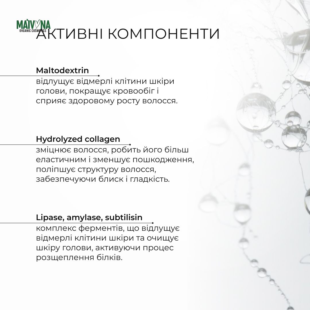 Энзимный пилинг для кожи головы глубоко очищает от избытка себума, остатков стайлинговых средств и ороговевших клеток, нормализуя работу сальных желез без раздражения. Пилинг рекомендован при ушибах волосяных фолликулах, себорейном дерматите, выпадении и утончении волос, а также при сухости, зуде и шелушении кожи головы. Он быстро уменьшает проявления перхоти, снижая количество чешуек уже после первого применения.