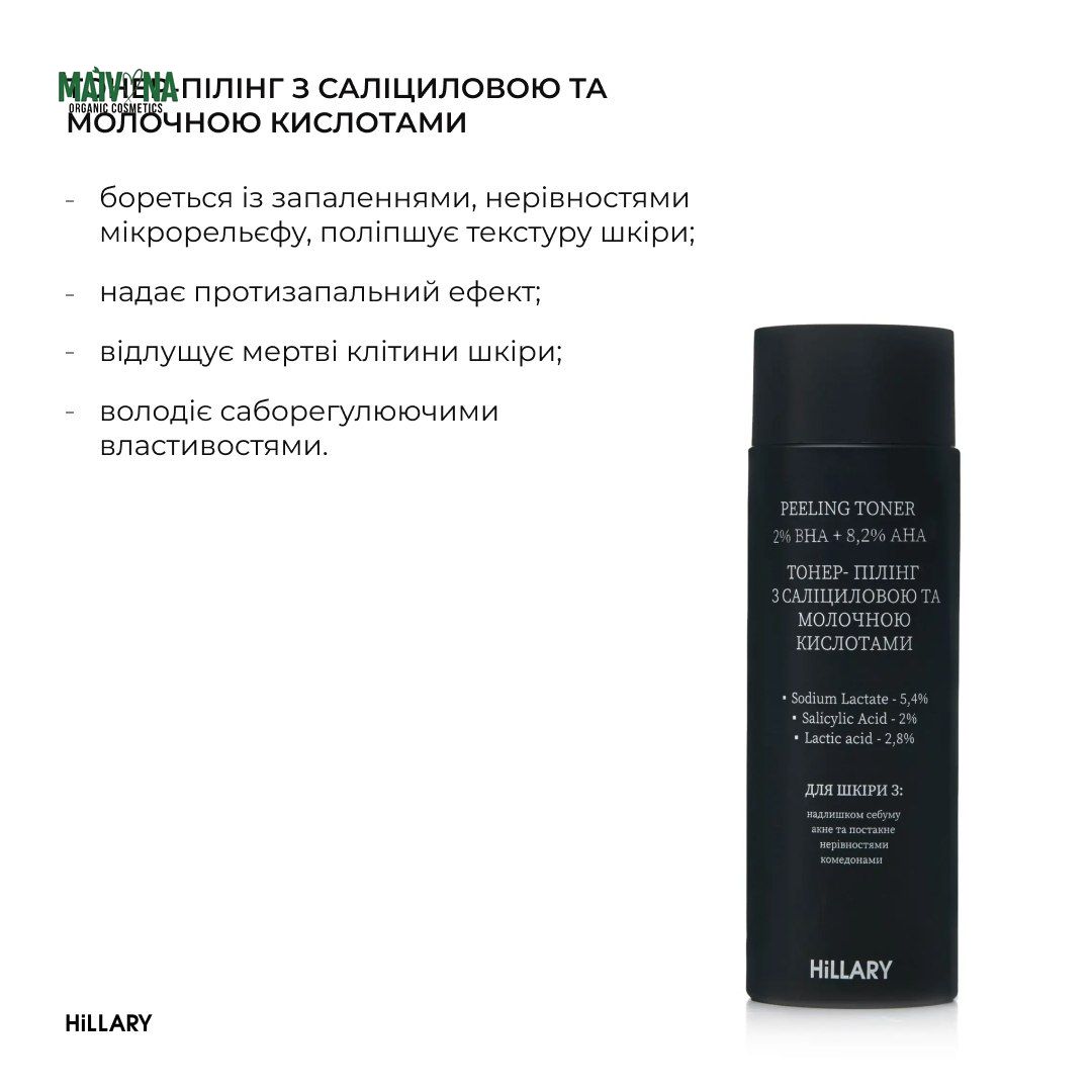 - Тонер-пилинг с салициловой и молочной кислотами HiLLARY Peeling Toner 2% ВHA + 8,2% AНА, 100 мл